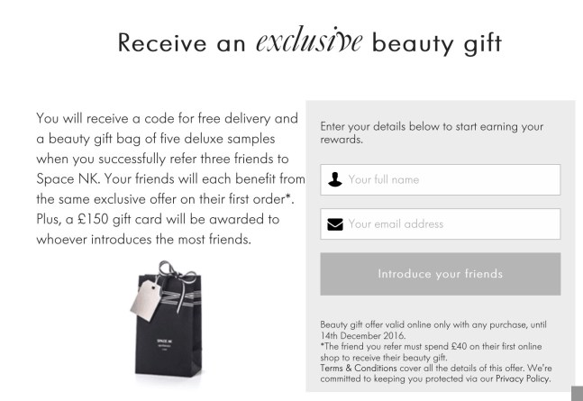 Currently when you sign up / place your first Space NK order online with a purchase(s) of £40 or over and use my referral link here, (then enter the promotional code you receive at checkout) you will get a beauty gift bag (items in bag may vary), free shipping and choice of 3 free samples at checkout. Beauty gift offer is valid online only, until 14th December 2016 or while stocks last. As you can see I will also receive a beauty gift bag when three friends place orders and then for the next three I will receive £10 credit.