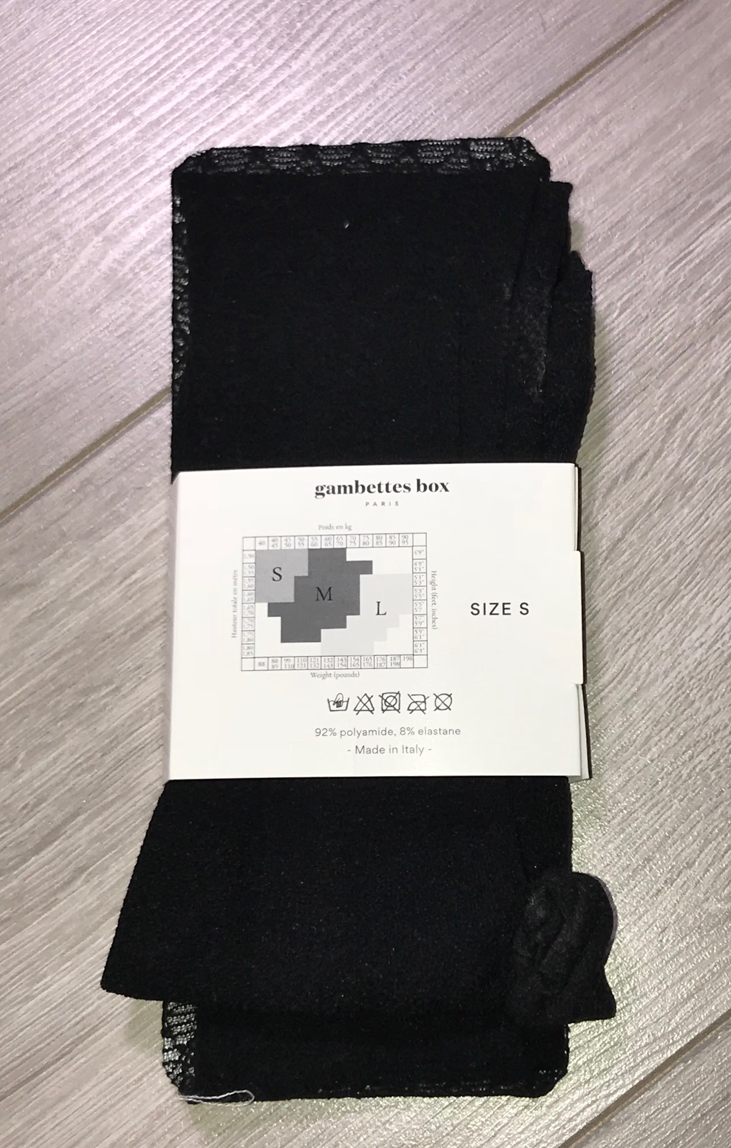 Black Haute Voltige Tights – 20D – 90% Polyamide & 10% Elastane (made in Italy): – love the rectangle pattern but just takes a bit more work to make them look ok on, pattern even etc – do feel and look good though when you get them adjusted.